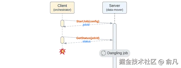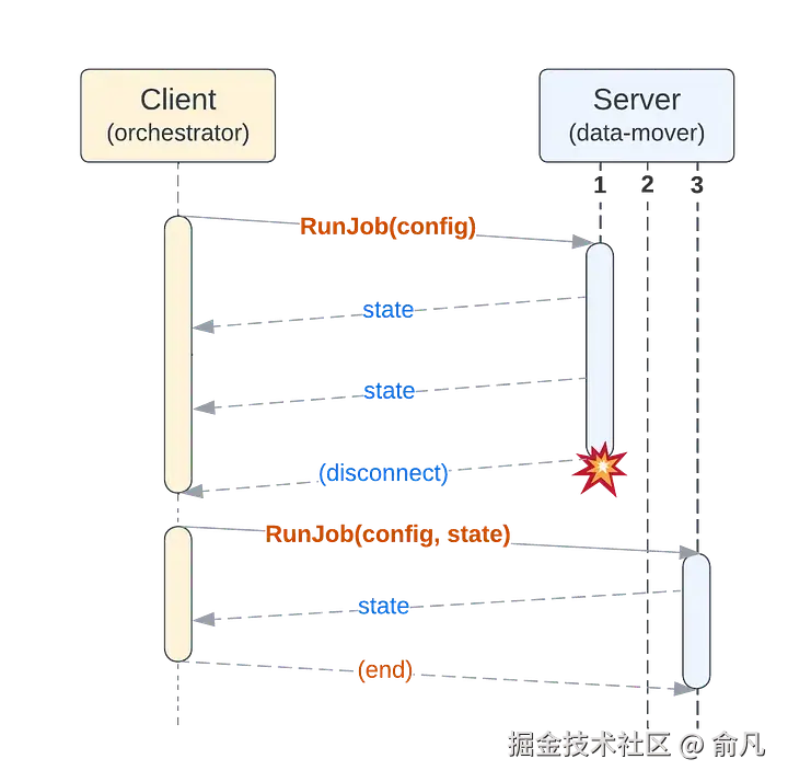 至于连接的脆弱性问题,我们的任务原本就需要具备可恢复性。因此,如果连接中断,客户端可以发出一个新的长期有效的 RunJob 请求(使用相同的重复性密钥和配置),而服务器则可以根据其最新状态继续执行该任务。