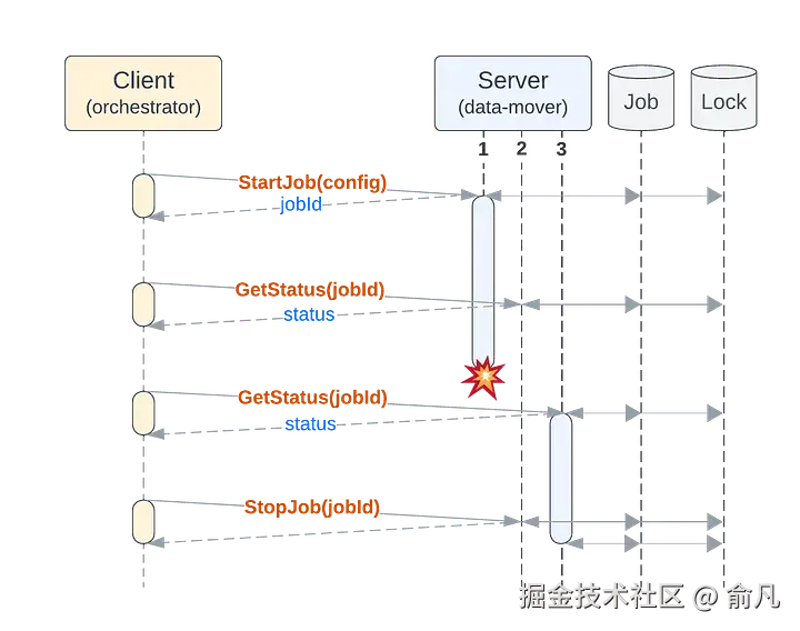 我们用 3 个服务器实例、1 个作业数据库以及 1 个锁服务将这一切整合起来。以下是执行一个示例作业的步骤序列,其中包括在另一个服务器实例上的恢复操作: