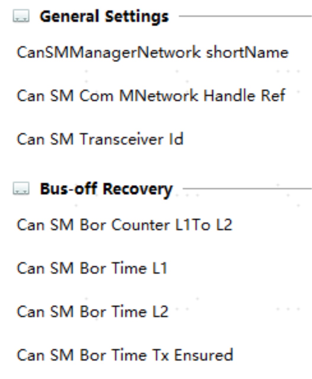 Can SM Bor Time Tx Ensured检查busoff的持续时间。这个配置项理解有点特别,在busoff恢复起来之后,CANSM还不认为恢复成功,需要通过发送PDU来确定恢复成功,而且并不是有应答就算恢复成功,而是需要PDU发送成功一段时间才认为CAN总线恢复起来了。如果在这段时间内再次产生busoff,这个时间又会重新再进行计算。这个时间就是这个配置项。