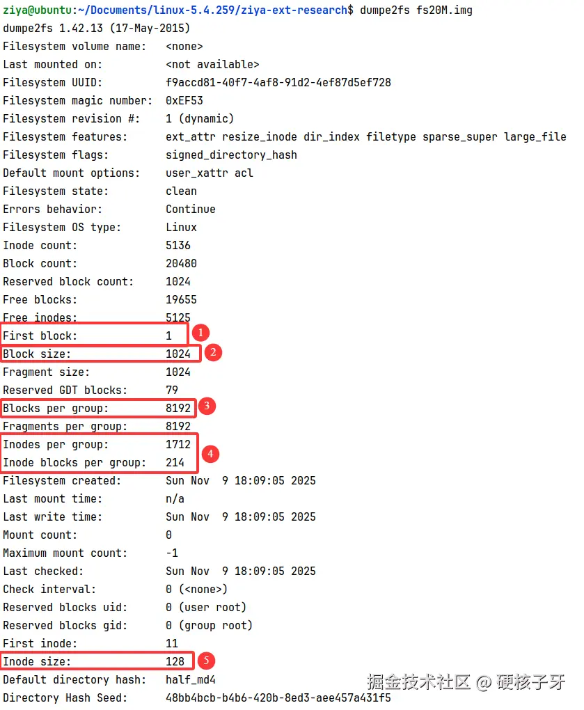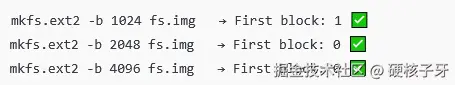 看红色序号1与2的位置,当块大小是1024B的时候,first block=1,与我们前面说的一致,block=0的位置是boot block。那如果block size改成2048B、4096B呢?看结果