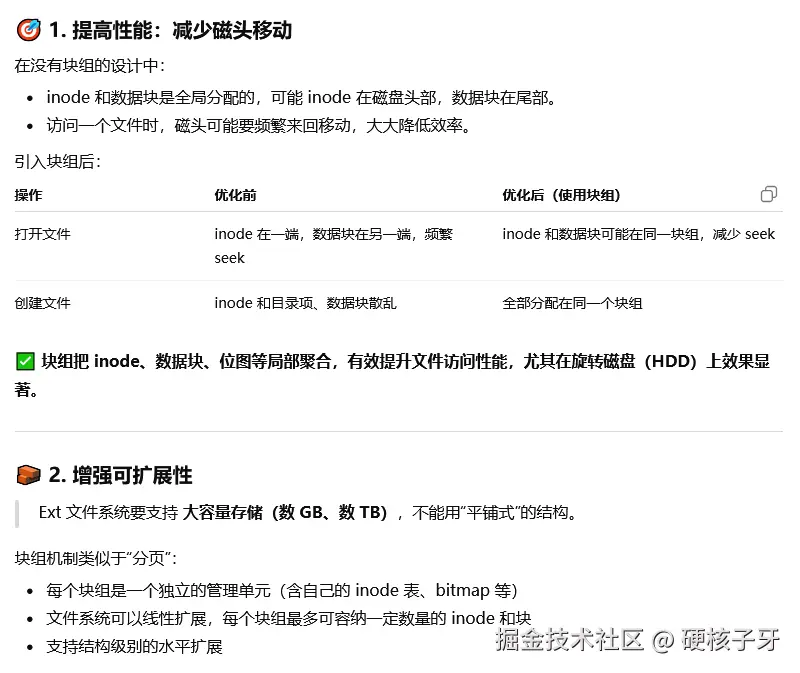 综合来说,ChatGPT答案想告诉我们的是,EXT2引入块组,其一是解决EXT1文件系统存在的缺陷,其二是为未来即将到来的多核多线程时代打下架构基础