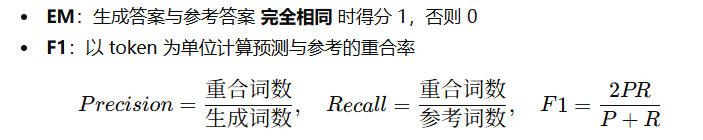 | 开放问答(RAG) | F1 + ROUGE / BLEU | 平衡文本正确性和语义覆盖 |