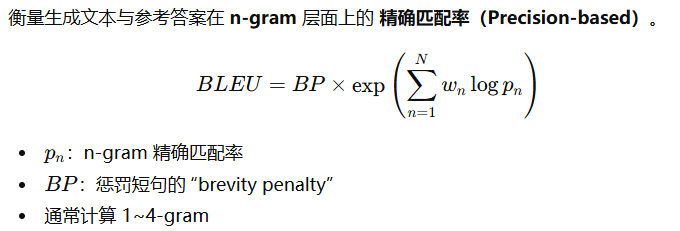 衡量 生成文本与参考文本在 n-gram 层面的重合度。