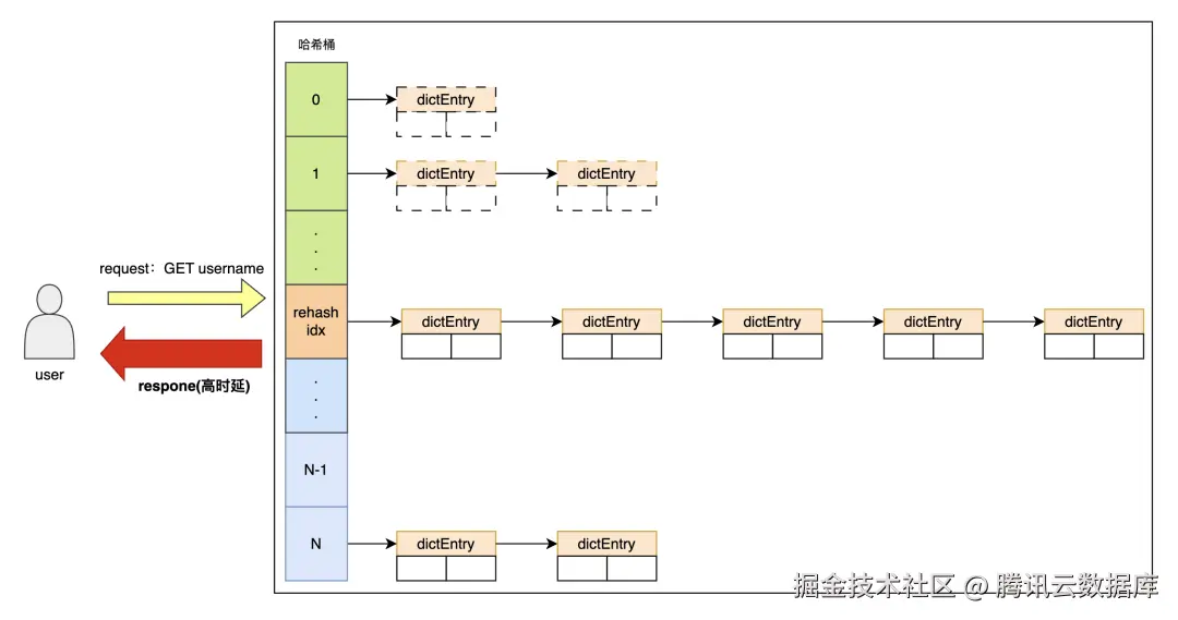 这种"顺便"的代价可不小。被动rehash虽然将迁移成本分摊到每个用户请求中,但也意味着用户的每一次读写请求都会被强行增加一个额外的rehash步骤。在高QPS下,这会显著拉低系统整体的吞吐量和性能表现。正如在文章开头提到的线上事故中,Redis分片的平均时延翻倍,这其中就离不开被动rehash的"贡献"。
