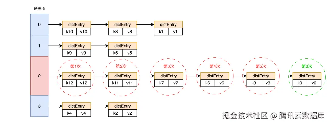 不难想到,这样的读取方式会带来下述问题:如果哈希桶中的key-value对太多,并且我们要查询的key非常不幸地位于链表尾部,那么我们就不得不遍历链表的所有节点才能读取到目标value,本次查询就会偏慢。如图二所示,如果用户执行"GET k0"命令,那么它需要进行6次比较才能完成查询。可以想象,如果哈希表永远只有4个桶,元素个数为N,那么每个桶的平均key-value对数量为N/4,每次查询平均需要做N/8次比较。在数据量N很大时,这样的查询性能是无法接受的。如何解决以上问题呢?很简单,给哈希表分配更多的哈希桶就行了。
