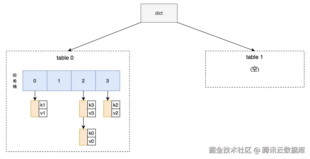 dict的数据结构如图一所示。在Redis这样的key-value数据库中,数据都是以key-value这样的键值对形式存储的,而dict则是存储键值对的核心数据结构。dict由两个哈希表组成,在普通状态下,dict只使用table0,table1为空。当用户写入一对key-value时,Redis首先会计算key的hash值,将key-value存入hash值对应的哈希桶里。每个哈希桶都是一个链表,新来的key-value对会插入到链表的头部。以图一为例,当写入k3-v3时,Redis首先计算出k3的hash值为2,然后将k3-v3插入到2号哈希桶的链表头部。