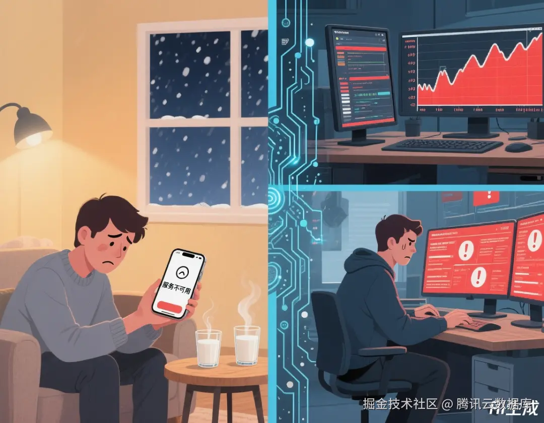 这是一个寒冷的冬夜,你拖着疲惫的身躯回到家中,盛满一杯热牛奶,躺在松软的沙发上。"终于到周末啦!",你一边庆祝着,一边郑重地打开了你最爱的娱乐软件,准备狠狠happy一波。但天有不测风云,平时能轻松登录的应用软件,今天竟然显示"登录失败"。你以为是网络问题,于是熟练地刷新页面、切换网络,但那个刺眼的提示依旧顽固地占据着屏幕,直到各种方法用尽,却依然无法登录后,你恍然大悟------应用服务崩了!