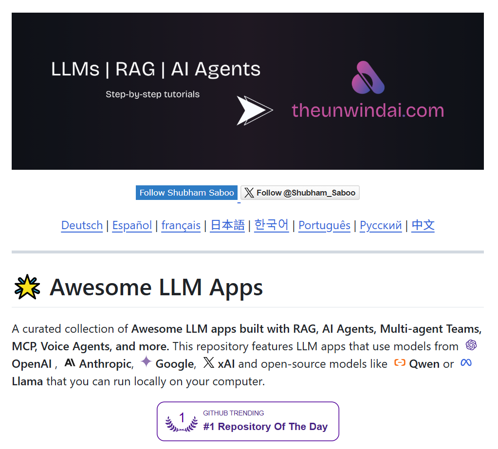 📌 相关地址: https://github.com/Shubhamsaboo/awesome-llm-apps
