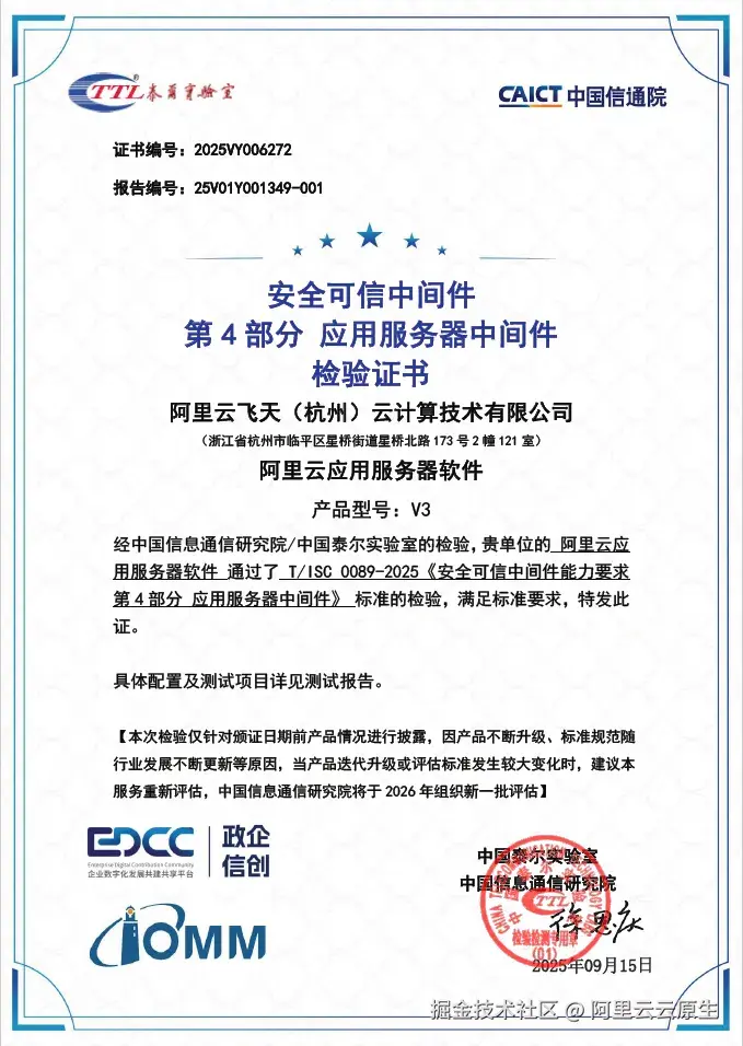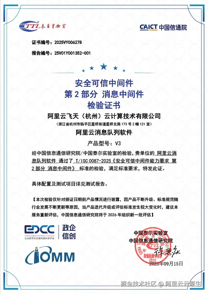 近日,由中国信通院主办的 2025(第五届)数字化转型发展大会在京举行。会上,"阿里云应用服务器软件 AliEE"、"消息队列软件 RocketMQ"、"云数据库 Tair"三款产品成功通过中国信通院"安全可信中间件"系列评估,成为首批获此认证的中间件产品。