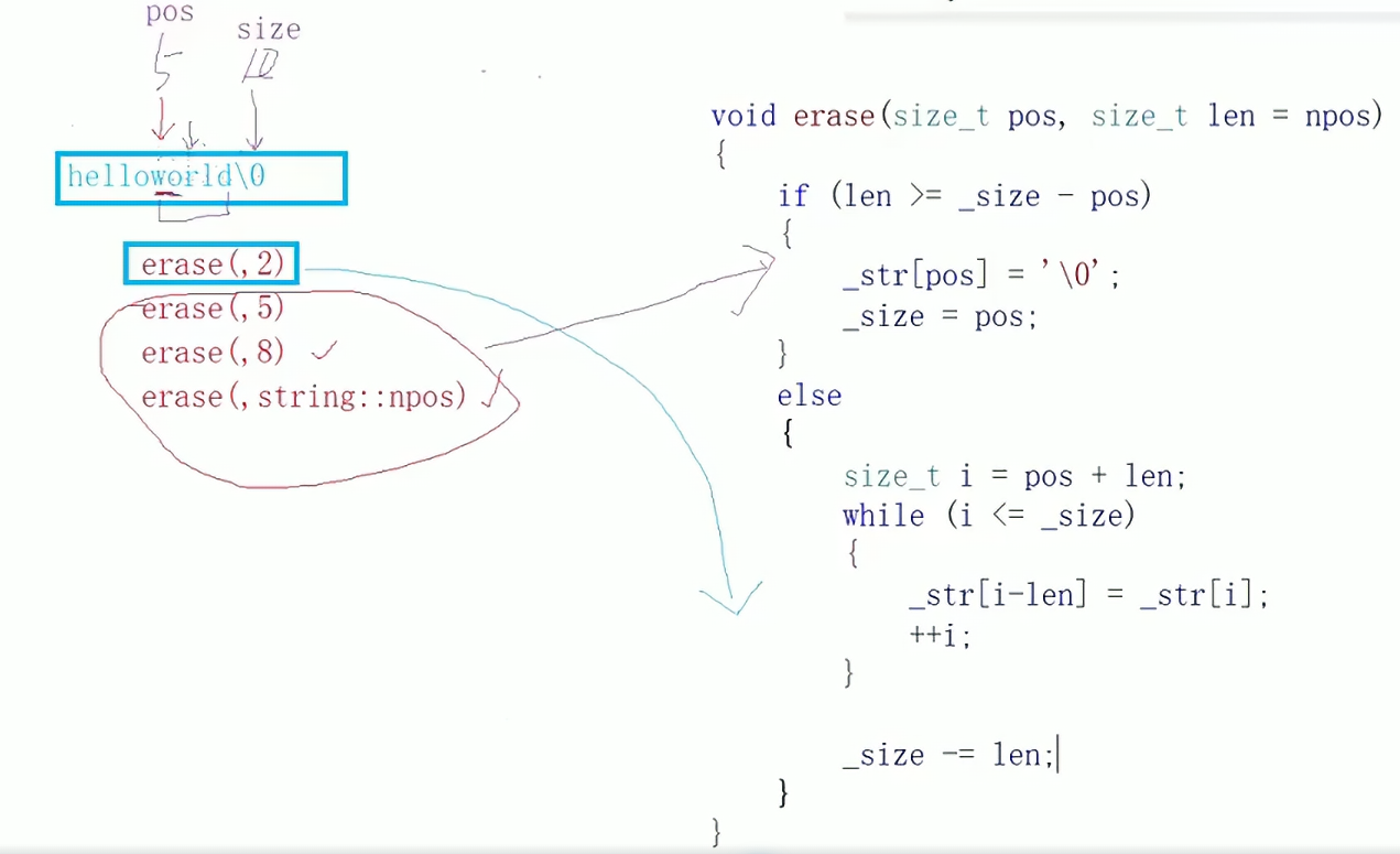 情况二、三:删除的len + pos > _size,说明要全部删除完毕;如果不传默认参数为string::npos为整数最大值;此时只需要将pos置为'\0'即可,最后将size变为size - len即可;