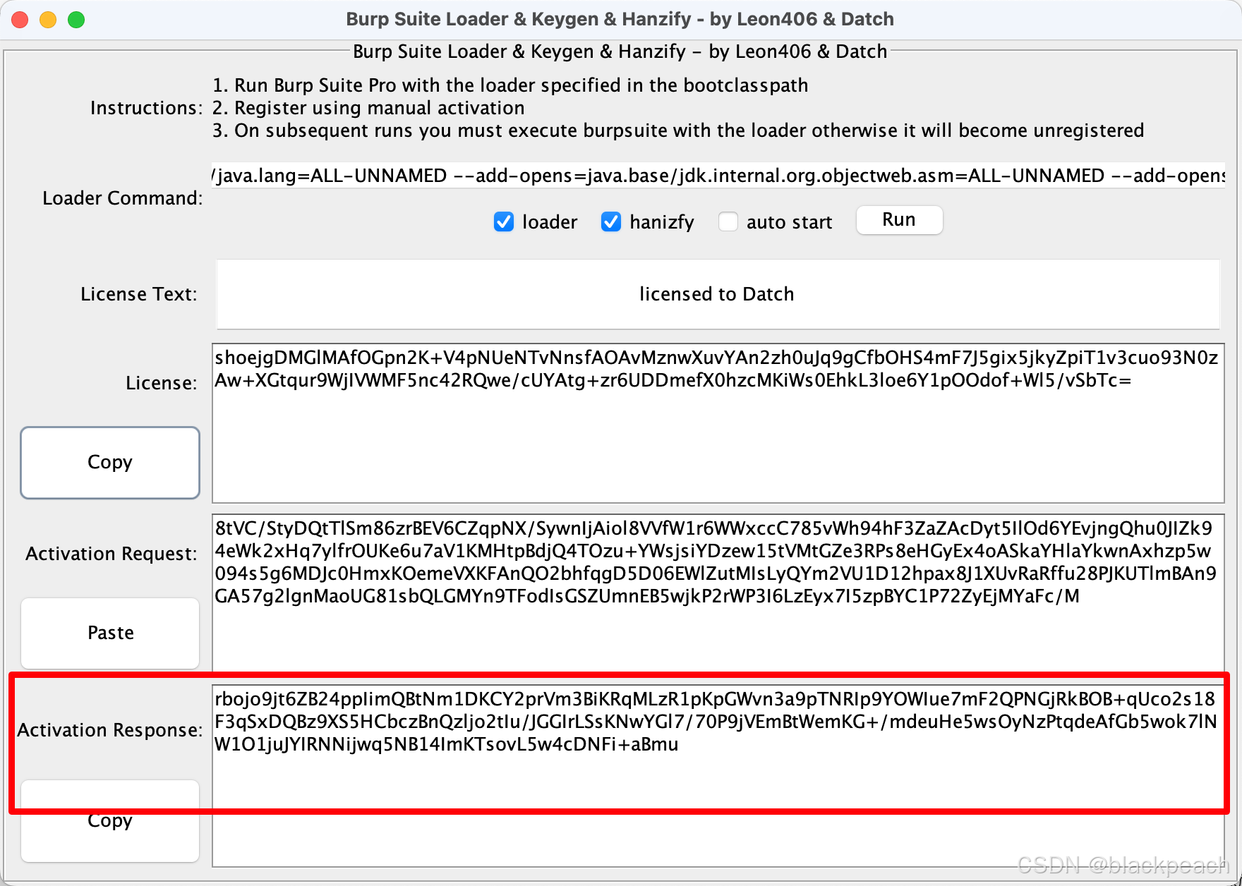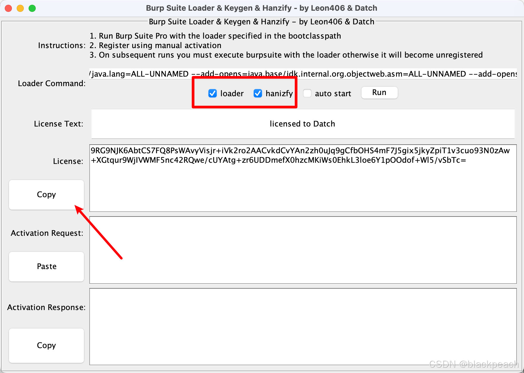 勾选激活器的 loader和hanzify,点击license左侧的copy复制它,然后手动从启动台启动burpsuite