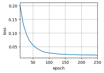 lr, num_epochs, device = 0.005, 250, d2l.try_gpu()
