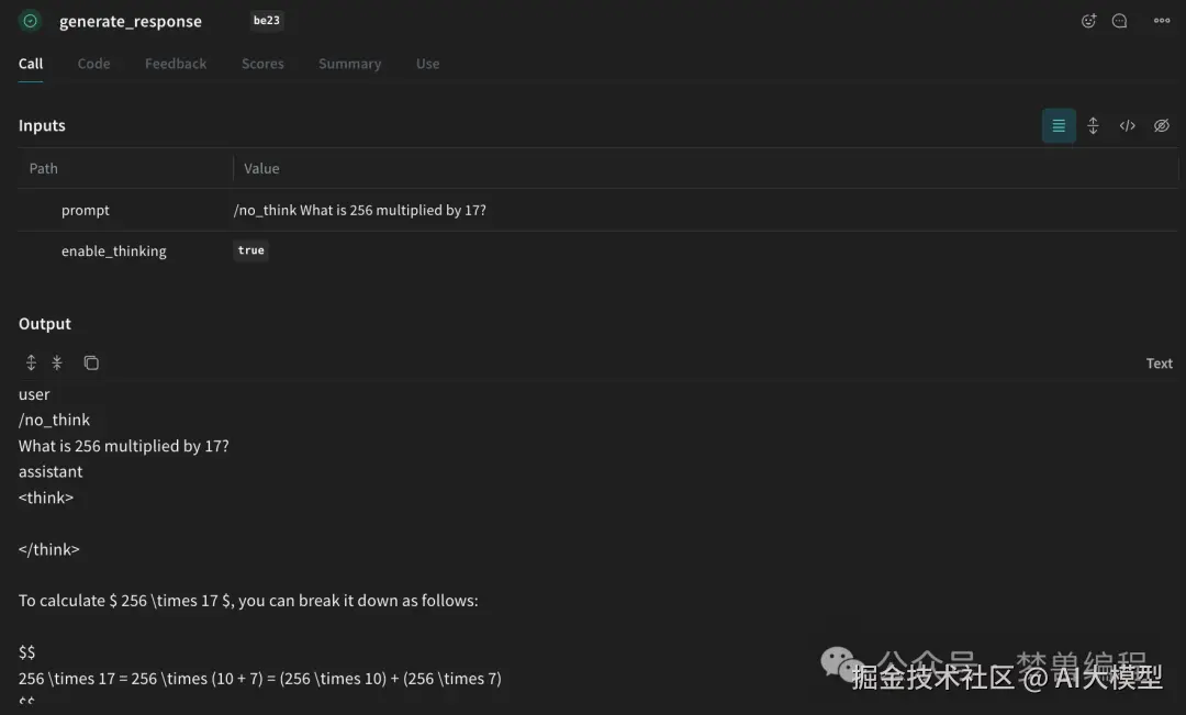 /no_think,即使API参数为True,也强制关闭思考展示。 - 后处理 :如果只想要纯答案,可以在输出后通过字符串处理移除