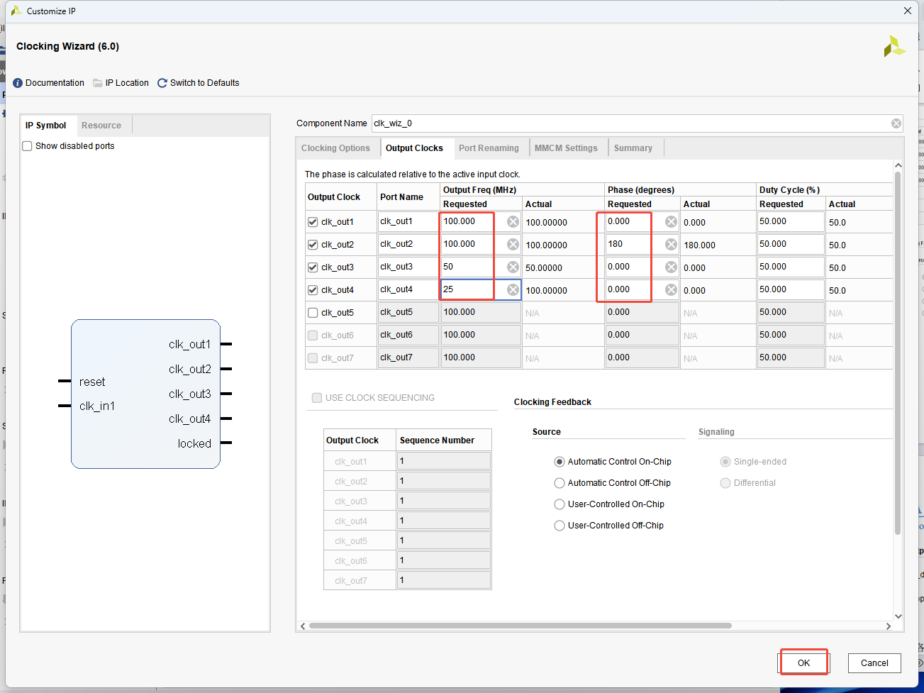 Phase (degrees)"为设置时钟的相位偏移,第二路100MHz 的时钟输出信号的相位偏移设置为 180