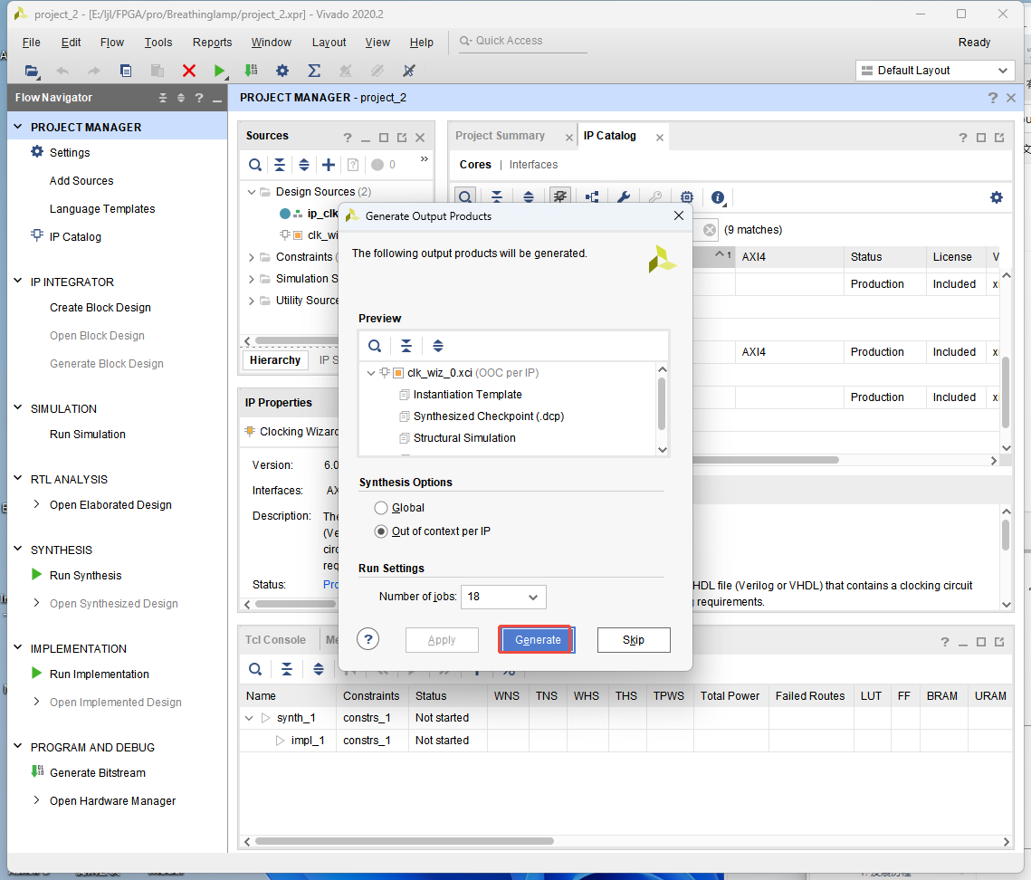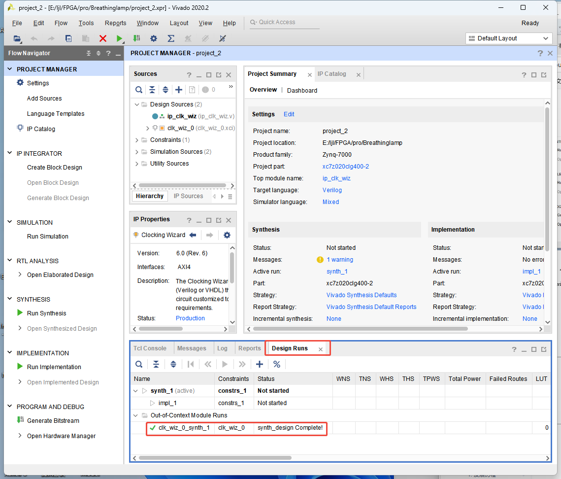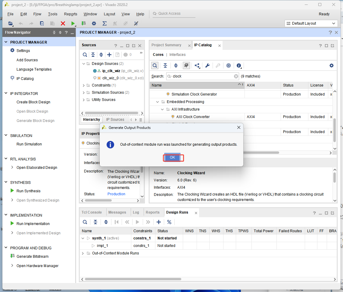 可以在"Design Runs"窗口的"Out-of-Context Module Runs"一栏中看到该 IP 核对应的 run