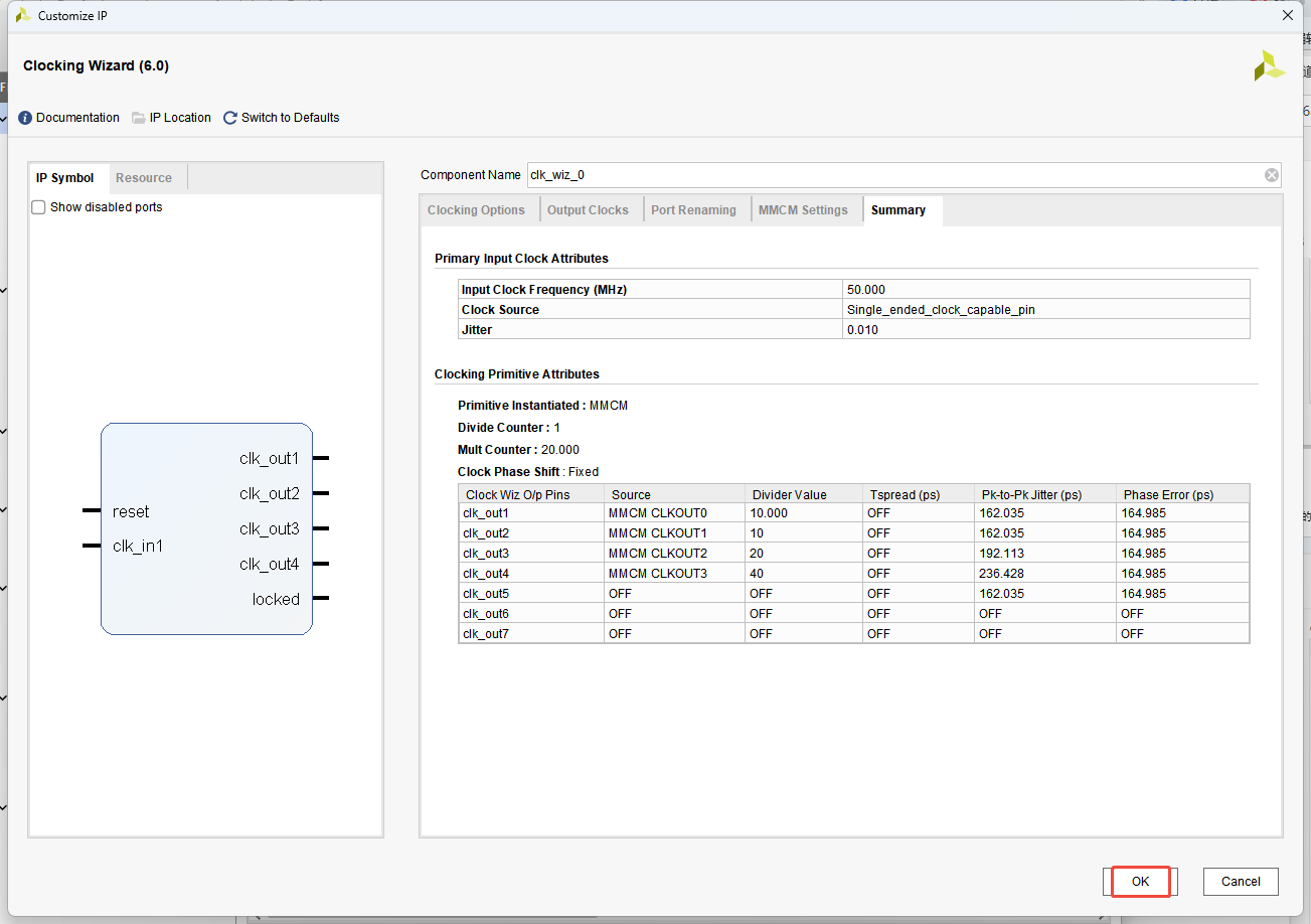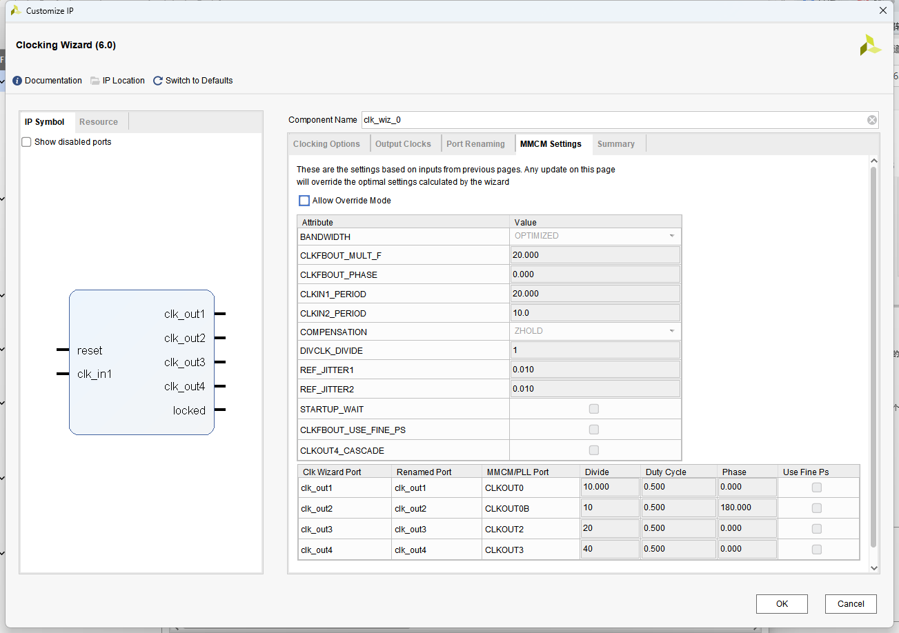 MMCM Setting"选项卡展示了对整个 PLL 的最终配置参数,不建议更改,所以这一步保持默认即可