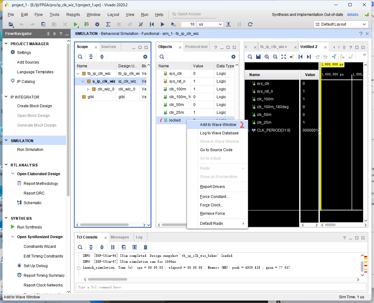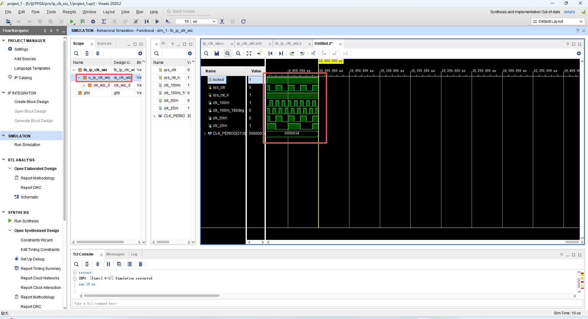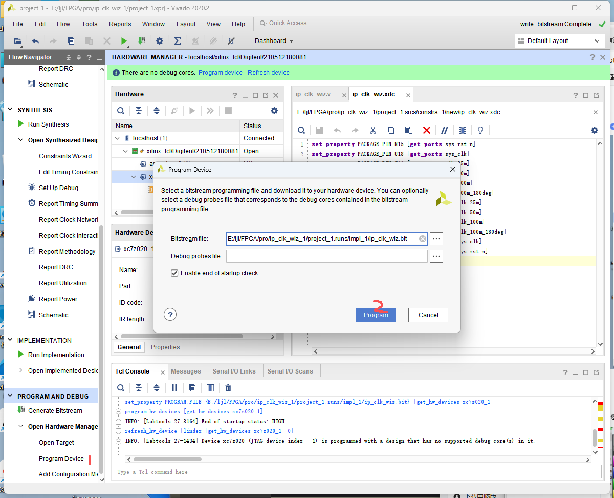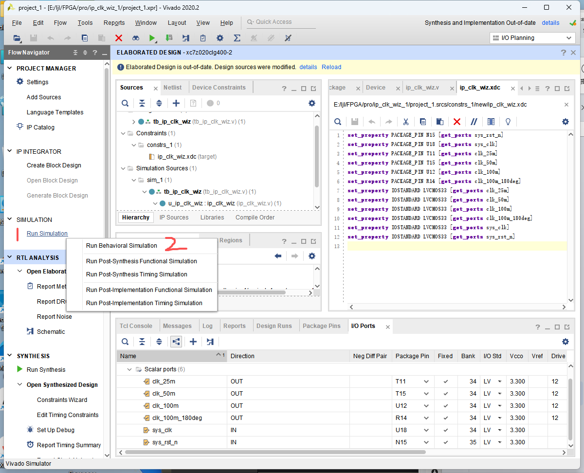 一个分频时钟(25MHz),并在 Vivado 中进行仿真以验证结果,最后生成比特流文件并下载到开发板上,