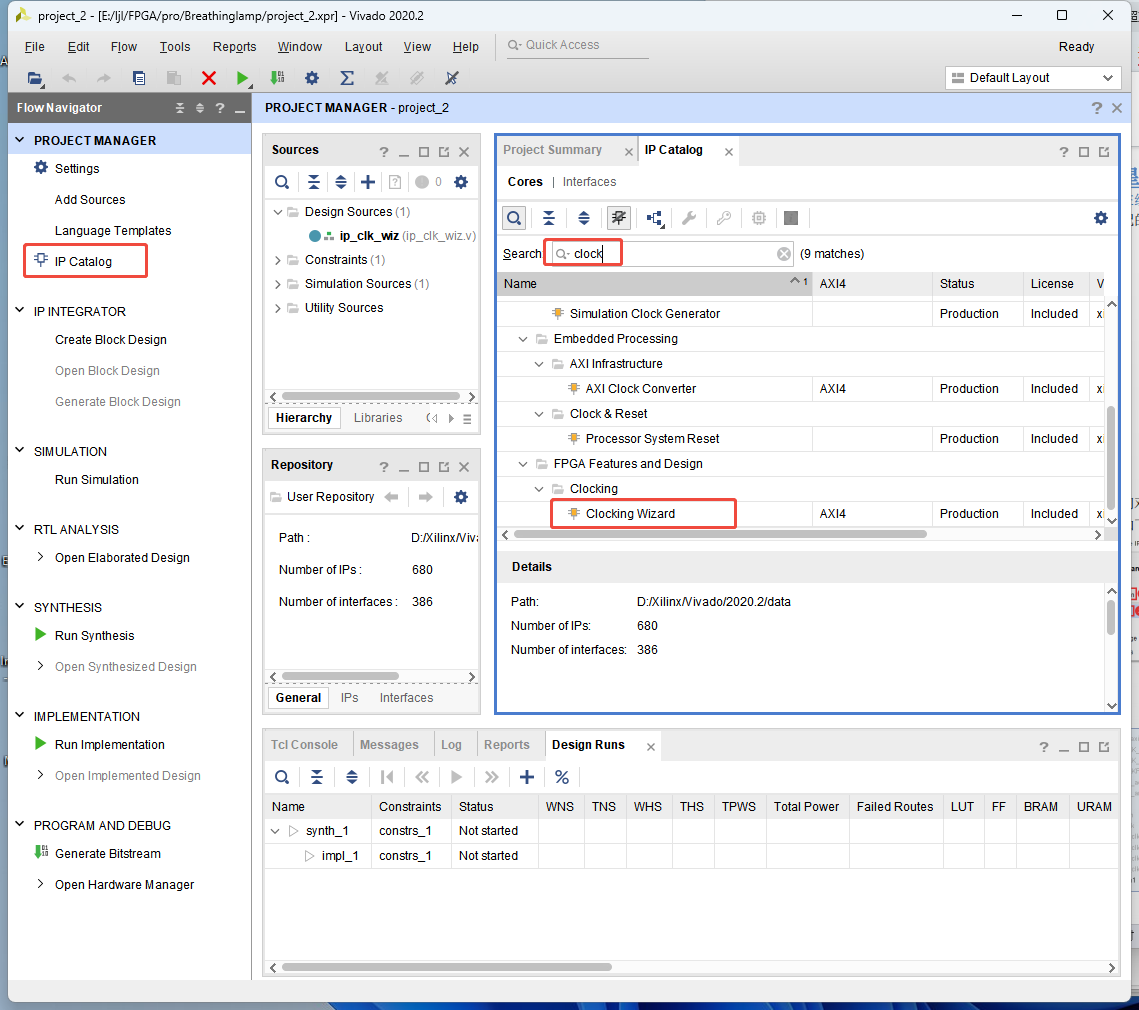 打开"IP Catalog"窗口后,在搜索栏中输入"clock"关键字