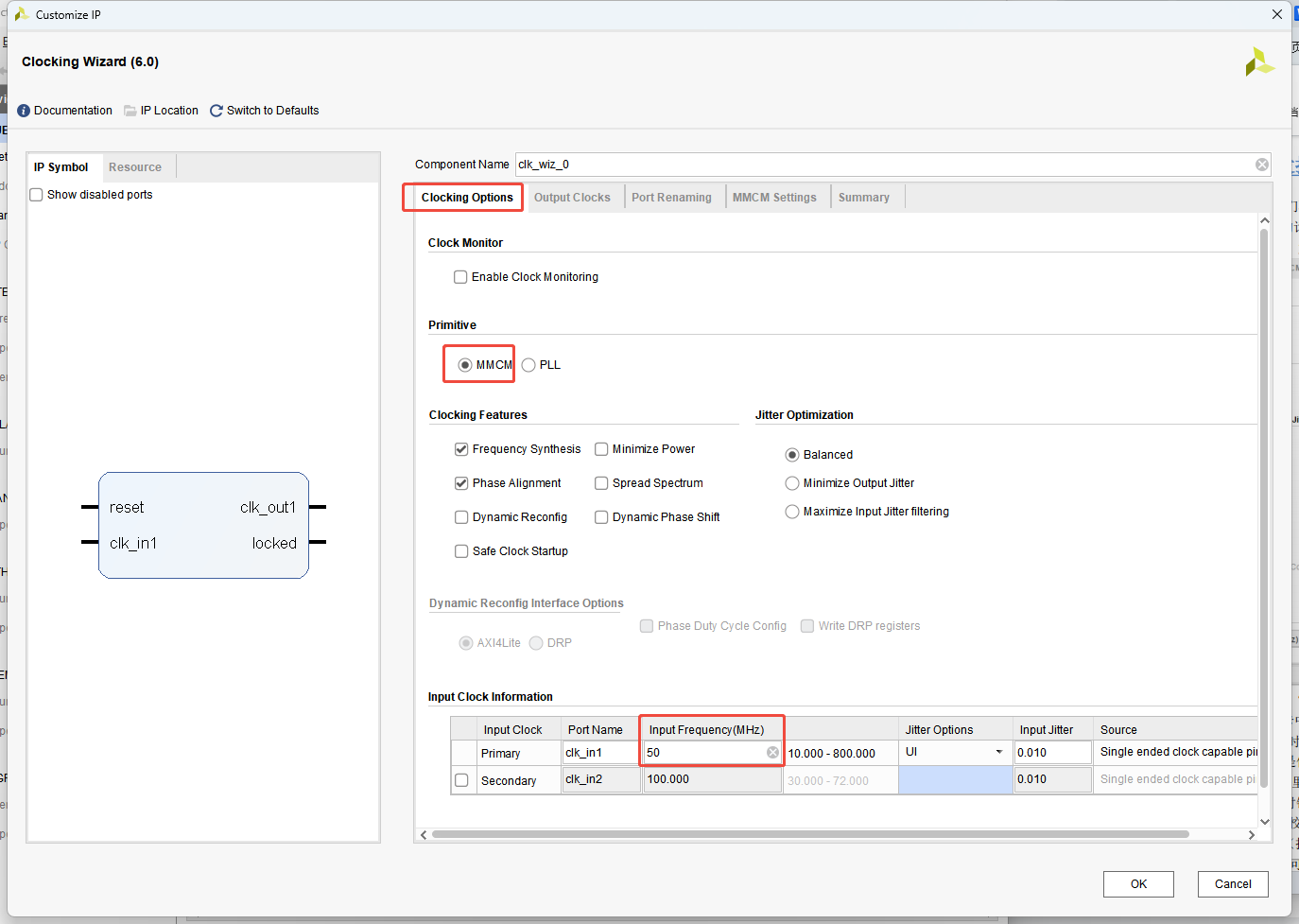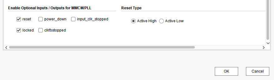Enable Optional lnputs/Outputs for MMCM/PLL(启用 MMCM/PLL 的可选输入/输出),其中 reset