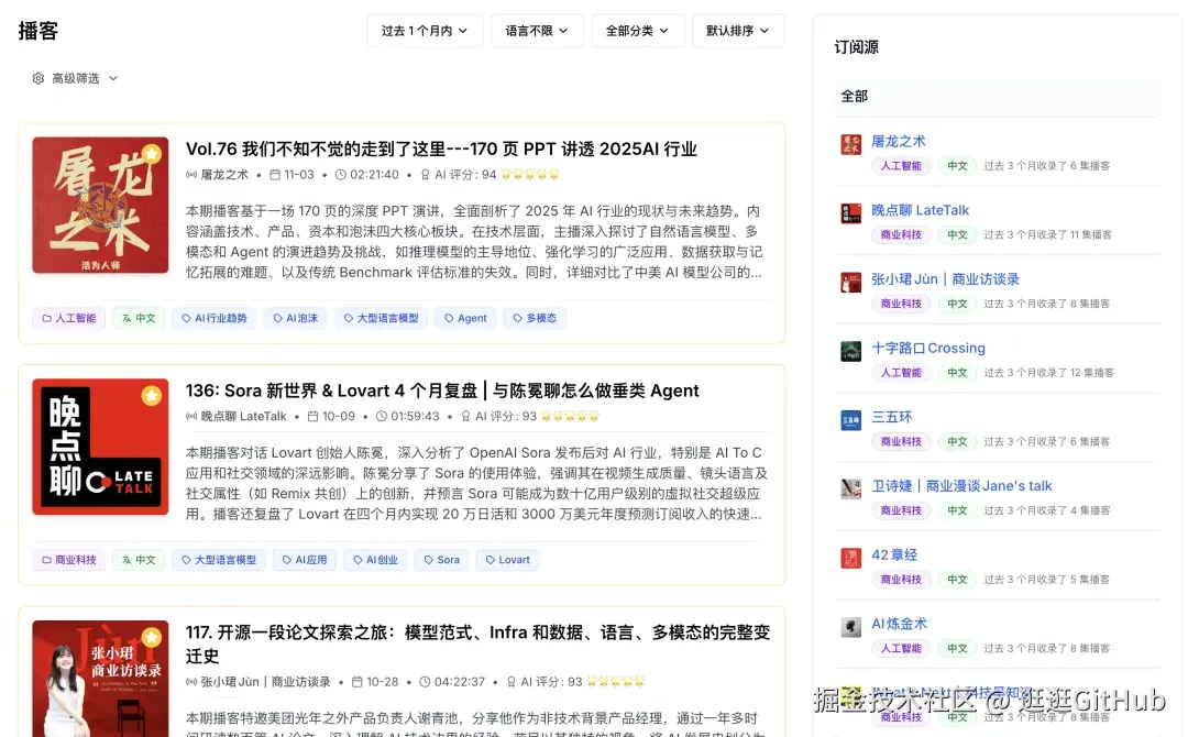 项目目前已经形成了完整的内容产出生态,除了生成网页版日报外,还能自动生成播客脚本,支持 RSS 订阅,甚至可以通过微信公众号每日推送,满足不同用户的内容消费习惯。