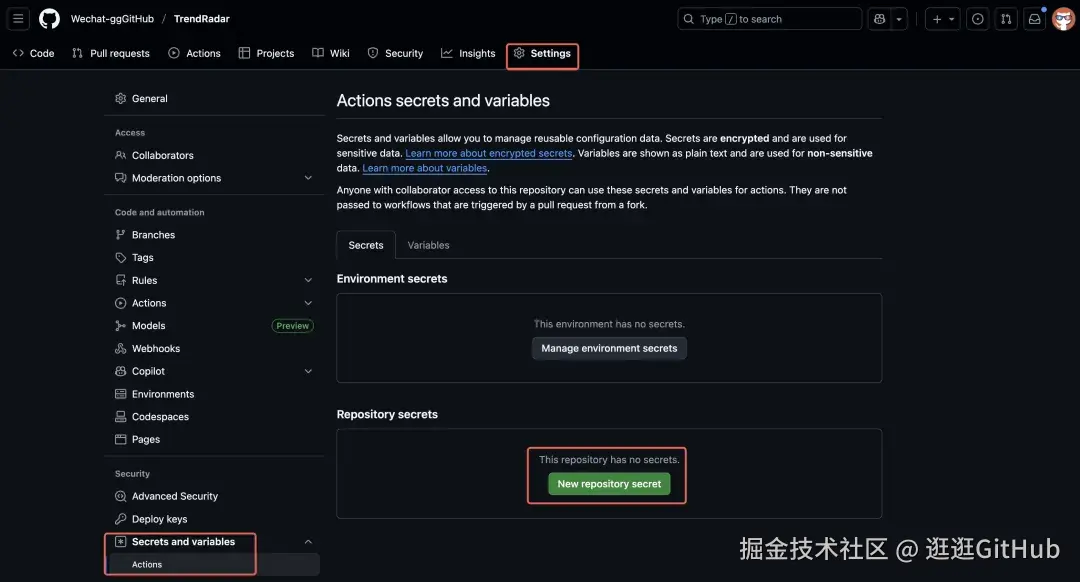 在你 Fork 后的仓库中,进入 Settings > Secrets and variables > Actions > New repository secret。