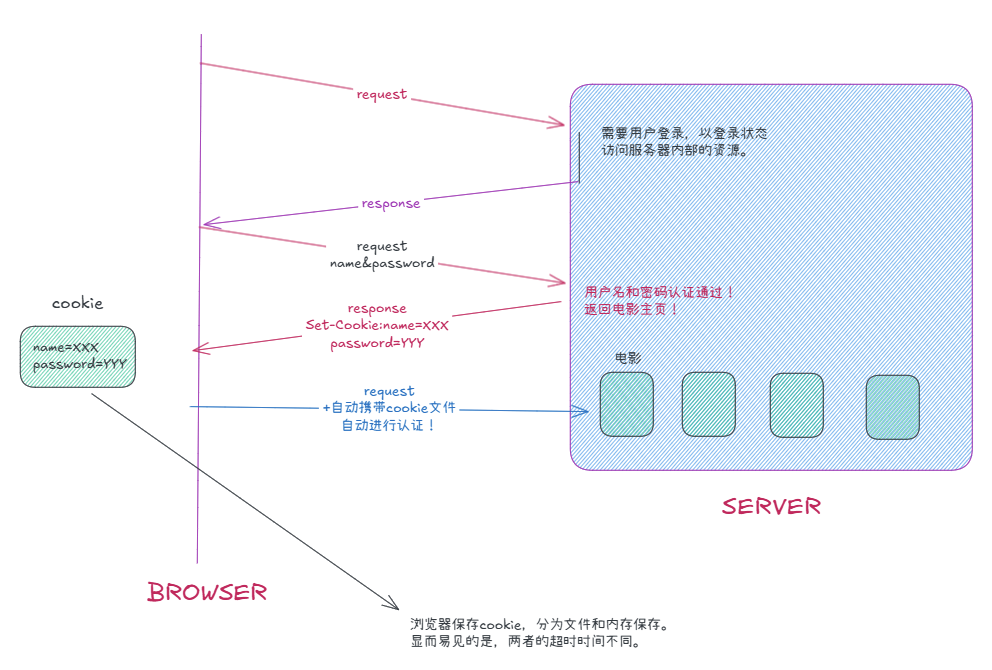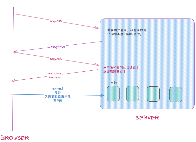这种无状态,实际上会给用户造成困扰:每访问一次资源,都是一次新的http请求 ;如果要求我们以**登录状态(客户端状态)**访问服务器,登录之后返回给用户网页页面,用户挑选要访问的资源(例如一个电影),就需要再一次进行登录认证。HTTP为了解决这个问题,引入了cookie。