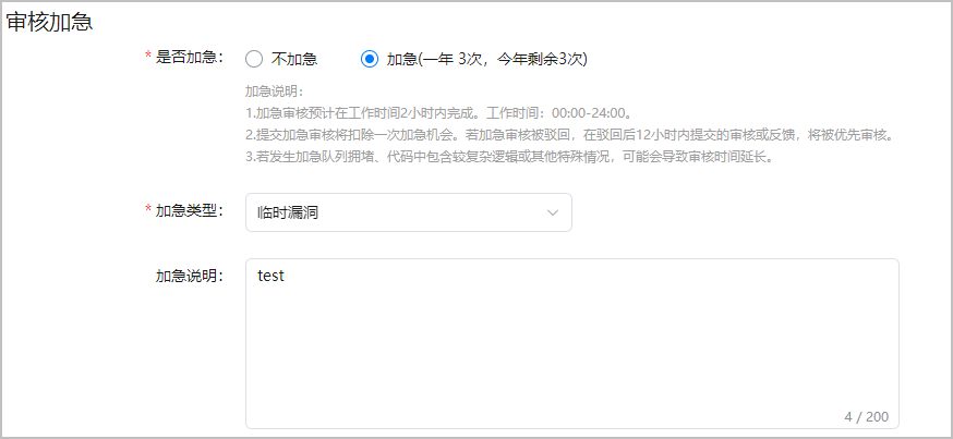 - 加急类型:当前加急类型包括临时漏洞、临时活动、其他。若配置为"临时漏洞",则表示您需要紧急修复缺陷;配置为"临时活动"表示正在进行一项商业类活动。