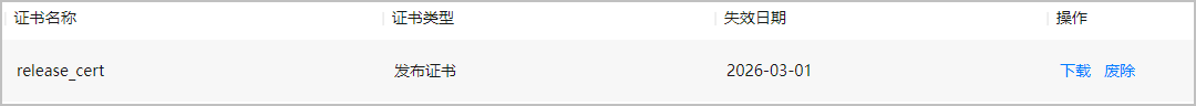 证书申请成功后,"证书管理"页面展示证书名称等信息。点击"下载",将生成的证书保存至本地,供后续签名使用。