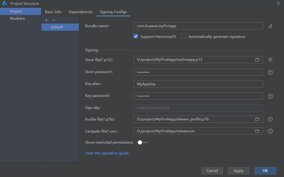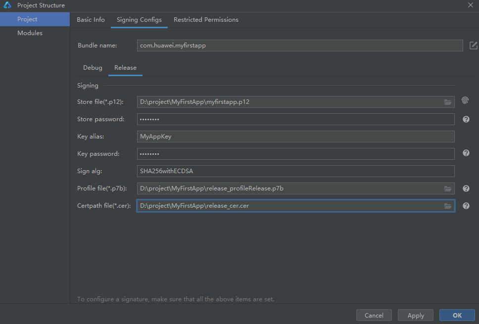 使用制作的私钥(.p12)文件、在AGC申请的证书文件和Profile(.p7b)文件,在DevEco Studio配置工程的签名信息,以构建携带发布签名信息的APP。