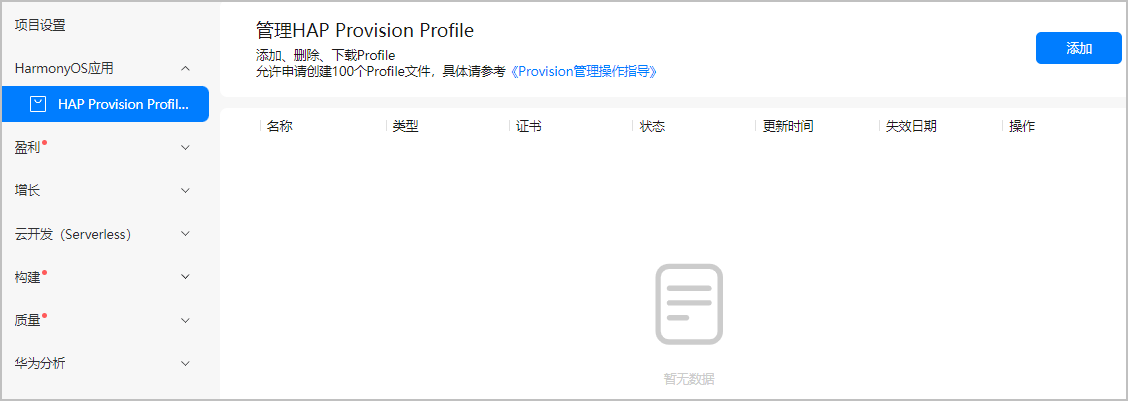 在左侧导航栏选择"HarmonyOS应用 > HAP Provision Profile管理",进入"管理HAP Provision Profile"页面,点击右上角"添加"。