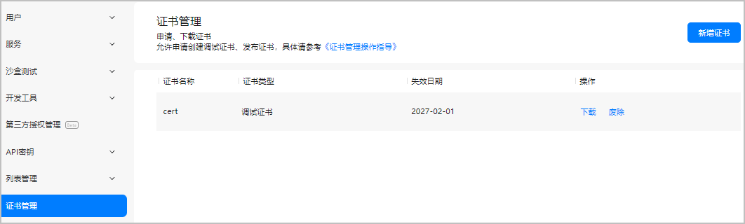 在左侧导航栏点击"证书管理",进入"证书管理"页面,点击"新增证书"。