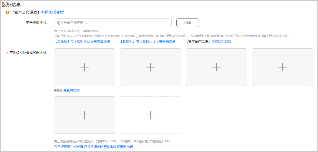 - 应用版权证书或代理证书:手机应用必选。支持JPG、PNG、BMP格式,默认展示五个图片上传框,您可点击虚线框内的"+"号继续添加。最多添加10张图片,每张图片不超过15MB。