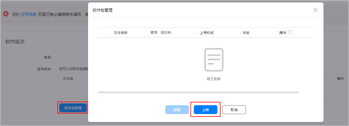 在"软件版本"下点击"软件包管理"后,在弹窗中点击"上传"。