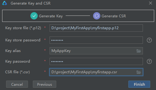 在申请数字证书和Profile文件前,首先需要通过DevEco Studio来生成密钥和证书请求文件。