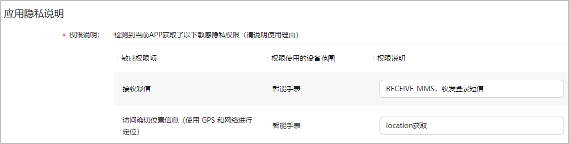 如检测到应用软件包涉及获取敏感隐私权限,您需为每个敏感权限项填写相应的权限说明,每条权限说明最大支持500字符。