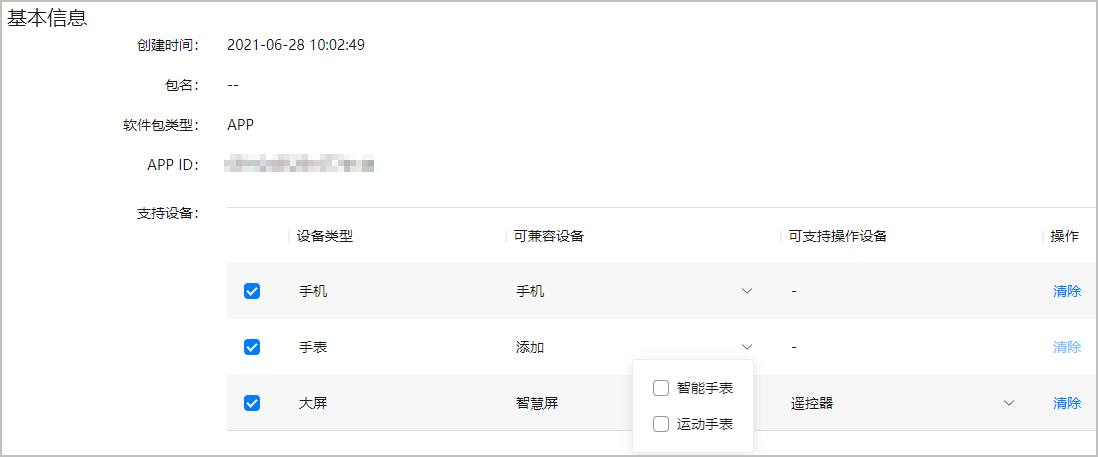 | 支持设备 | 默认显示创建应用时选择的设备类型。 * * 在"设备类型"栏,可新增或减少分发设备。注意 * * * 支持由单设备改为多设备,或多设备改为单设备。 * 升级应用仅允许增加设备类型,不支持删除原有在架应用已选择的设备类型。例如,在架应用支持的设备类型为"手机",升级应用时您无法取消勾选"手机"选项。 * * 在"可兼容设备"栏中,点击下拉箭头,可根据需要选择兼容设备。 * * * 手机:可选择手机、平板。 * 大屏:可选择智慧屏。 * 手表:可选择智能手表、运动手表。 * * 在"可支持操作设备"栏中,点击下拉箭头,可根据需要选择支持的操作设备。 * * * 手机:无。 * 大屏:可选择遥控器、手柄、体感。 * 手表:无。 * * 在"操作"栏中,点击"清除",可一键清除所选的兼容设备与支持的操作设备。 说明路由器设备不支持设置兼容设备和操作设备。 |