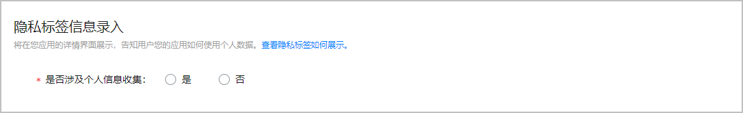 根据应用是否收集用户的信息数据选择是否在华为应用市场的应用详情页展示隐私标签,告知用户您的应用如何使用个人数据,具体请参见录入隐私标签信息。注意 只有支持手机、平板或大屏的HarmonyOS应用才需配置隐私标签信息录入。