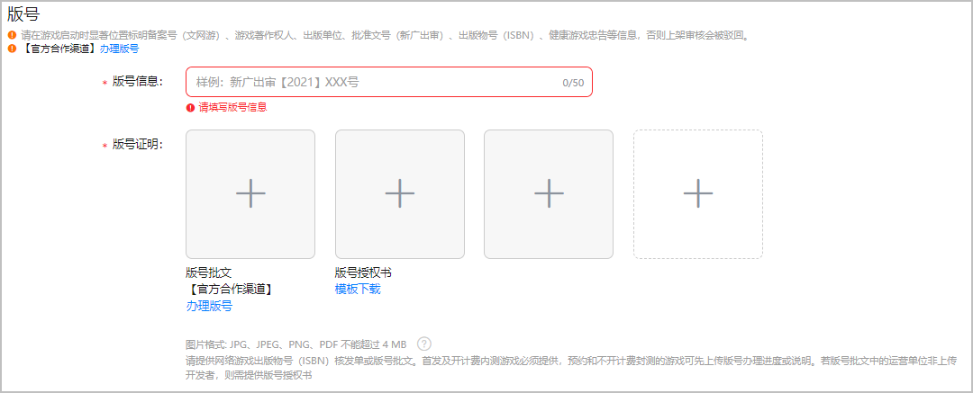 版号证明:必选,需上传"版号批文"或"版号授权书",图片格式支持JPG、JPEG、PNG、PDF。默认展示三个图片上传框,您可点击虚线框内的"+"号继续添加。最多添加5张图片,每张图片不超过4MB。若您上传了版号授权书,还需填写"授权书有效期"。