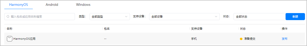 在应用列表首页中选择"HarmonyOS"页签,点击待发布的HarmonyOS应用名称。如应用较多,可点击"类型"下拉框仅筛选出HarmonyOS应用,或点击"支持设备"按设备类型筛选查找。