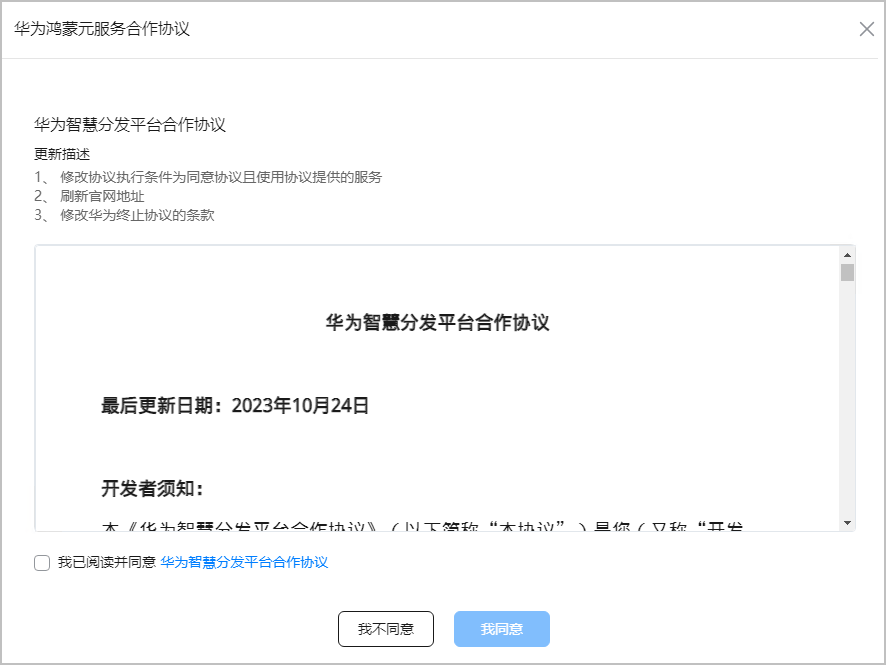 在左侧导航栏选择"应用信息"菜单。如果您尚未签署华为智慧分发平台合作协议,此时会弹出华为智慧分发平台合作协议对话框,您需按提示进行协议签署。否则,页面将跳转回AGC首页,您将无法继续发布HarmonyOS应用。注意 只有帐号持有者和法务角色才有权限签署华为智慧分发平台合作协议。