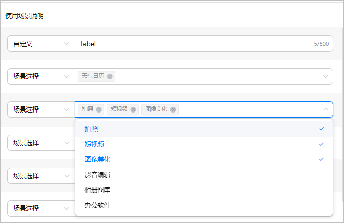 - 使用场景说明:可通过选择AGC提供的场景标签或者自定义文字来说明权限使用场景。自定义权限说明不得超过500字符。