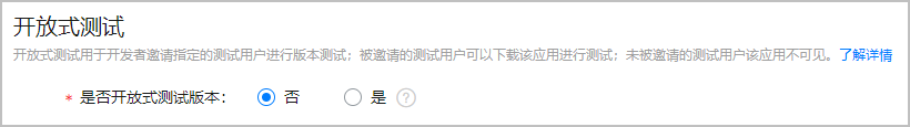 - 如您想发布为开放式测试版本,选择"是",具体配置请参见开放式测试操作指南。