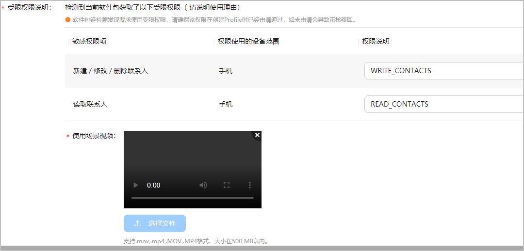 如检测到您的应用软件包涉及获取受限权限,您需为每个受限权限项填写相应的权限说明,并上传视频说明使用场景。