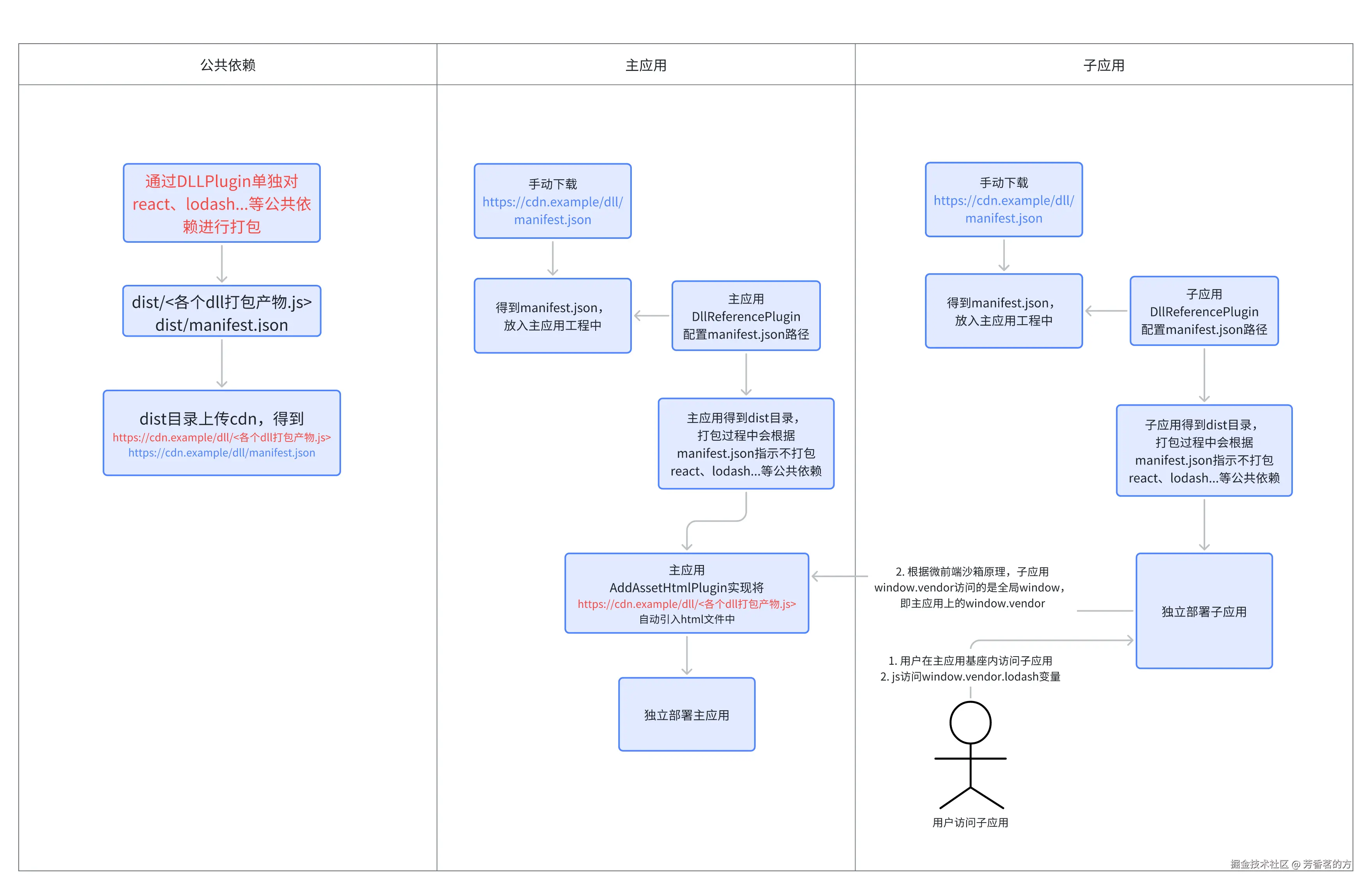 - 使用方在遇到react、lodash时候,就无需再次打包,将使用react和lodash模块的地方,根据manifest文件的指引去通过全局变量访问。
