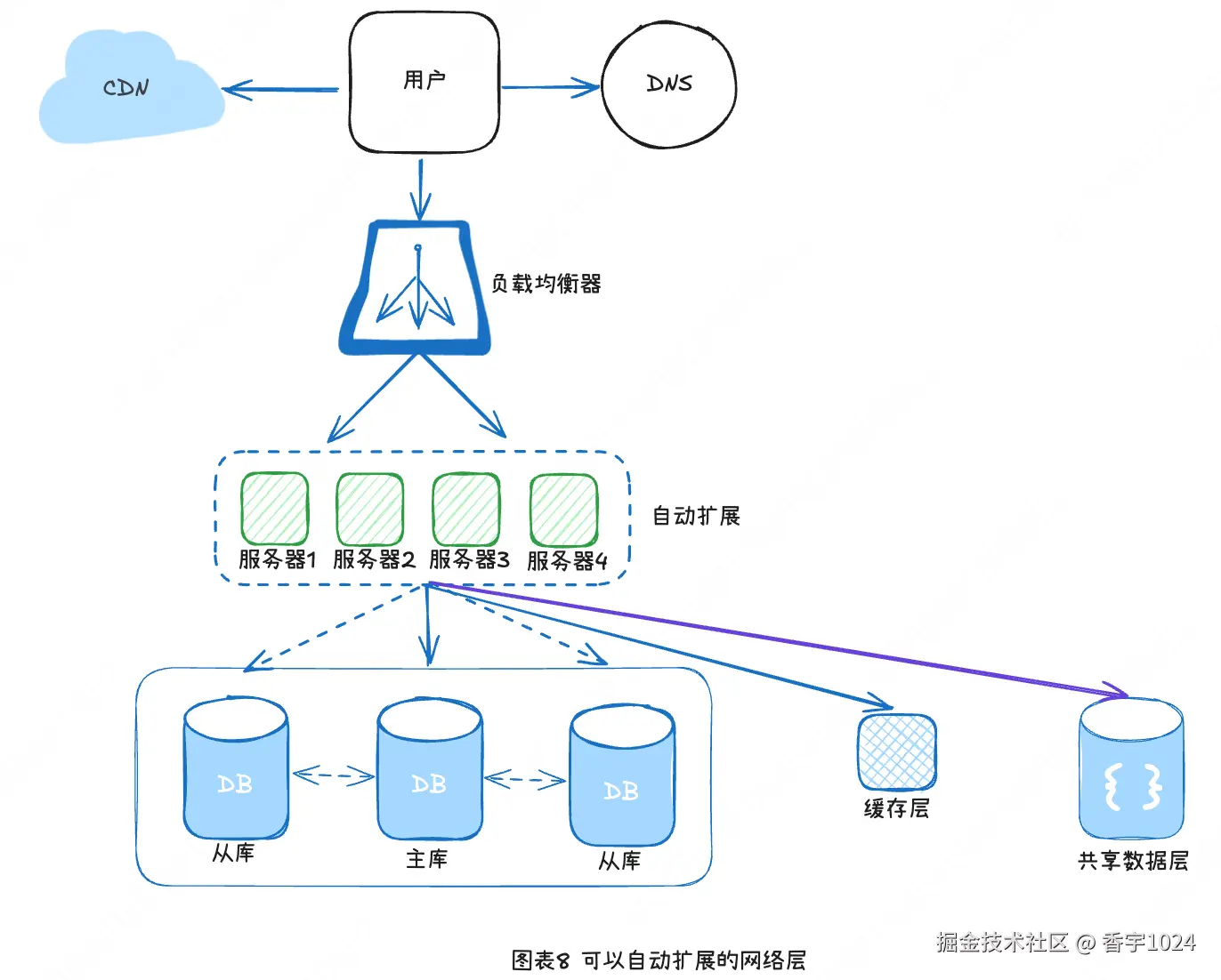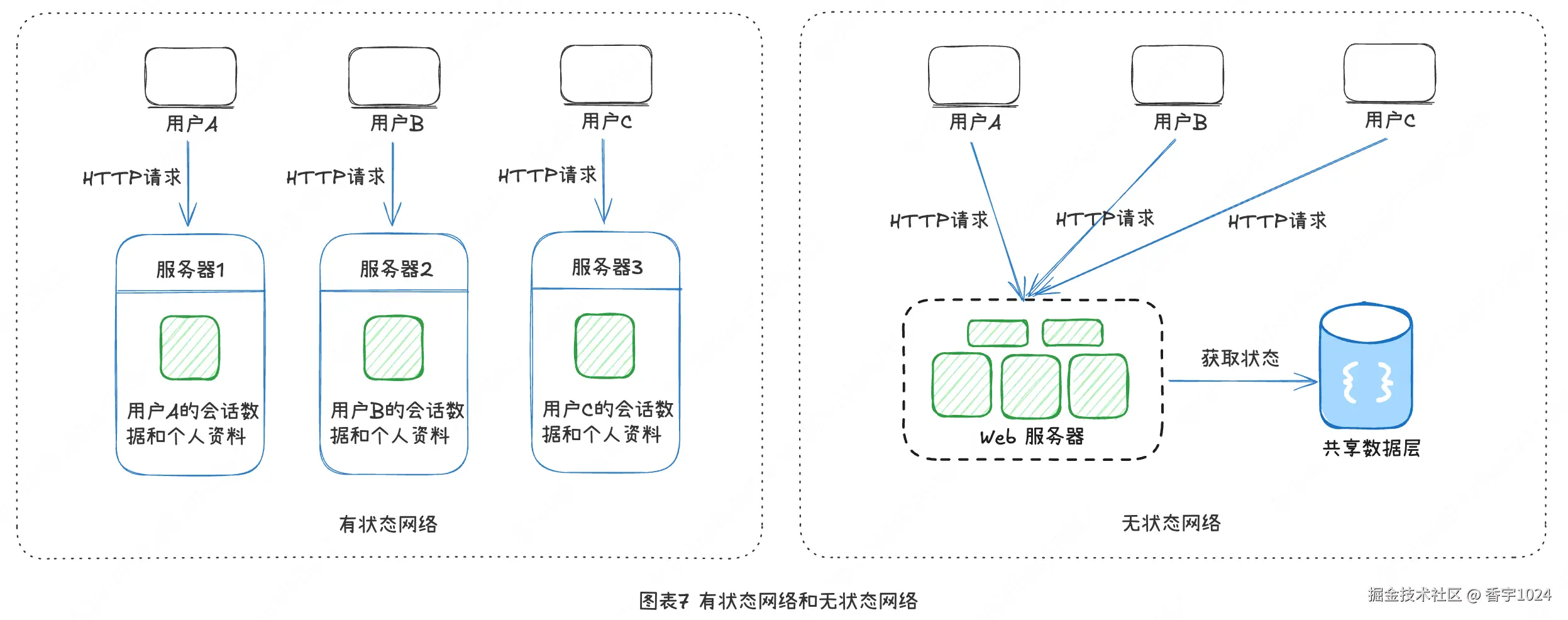 是时候横向扩展网络层了。在前文的设计中,用户登录信息是存储在Web服务器(网络层)中的,这叫做有状态网络,由于要网络层服务器要"记住"用户状态,所以难以扩展。无状态网络层是指服务器在处理请求时,不保存客户端的任何上下文状态。每个请求都是独立、完整、自足的,服务端只依赖请求中携带的信息就能处理完逻辑并返回响应。简单就是: "服务器忘记上一次你是谁,只看这一次你说了什么。"