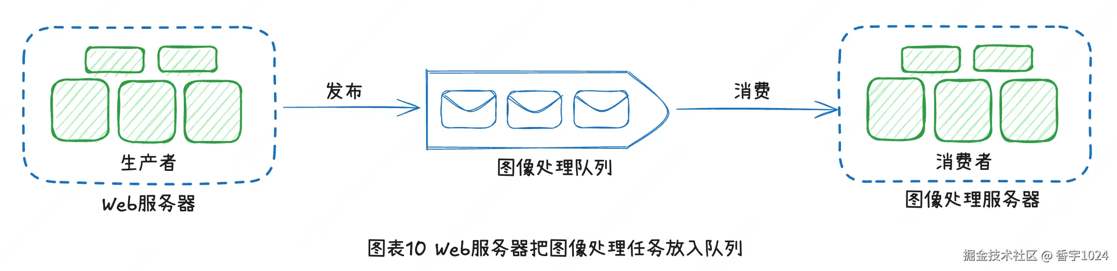 考虑以下用例:你的应用支持修改图像,包括裁剪、锐化、模糊化等,这些任务都需要时间来完成。Web服务器把图像处理的任务发布到消息队列。图像处理进程或服务(Worker)从消息队列中领取这个任务,并异步执行。生产者和消费者都可以独立地扩展。队列的规模变大以后,可以加入更多的Worker,以减少处理时间。如果队列在大部分时间中都是空的,就可以减少Worker的数量。