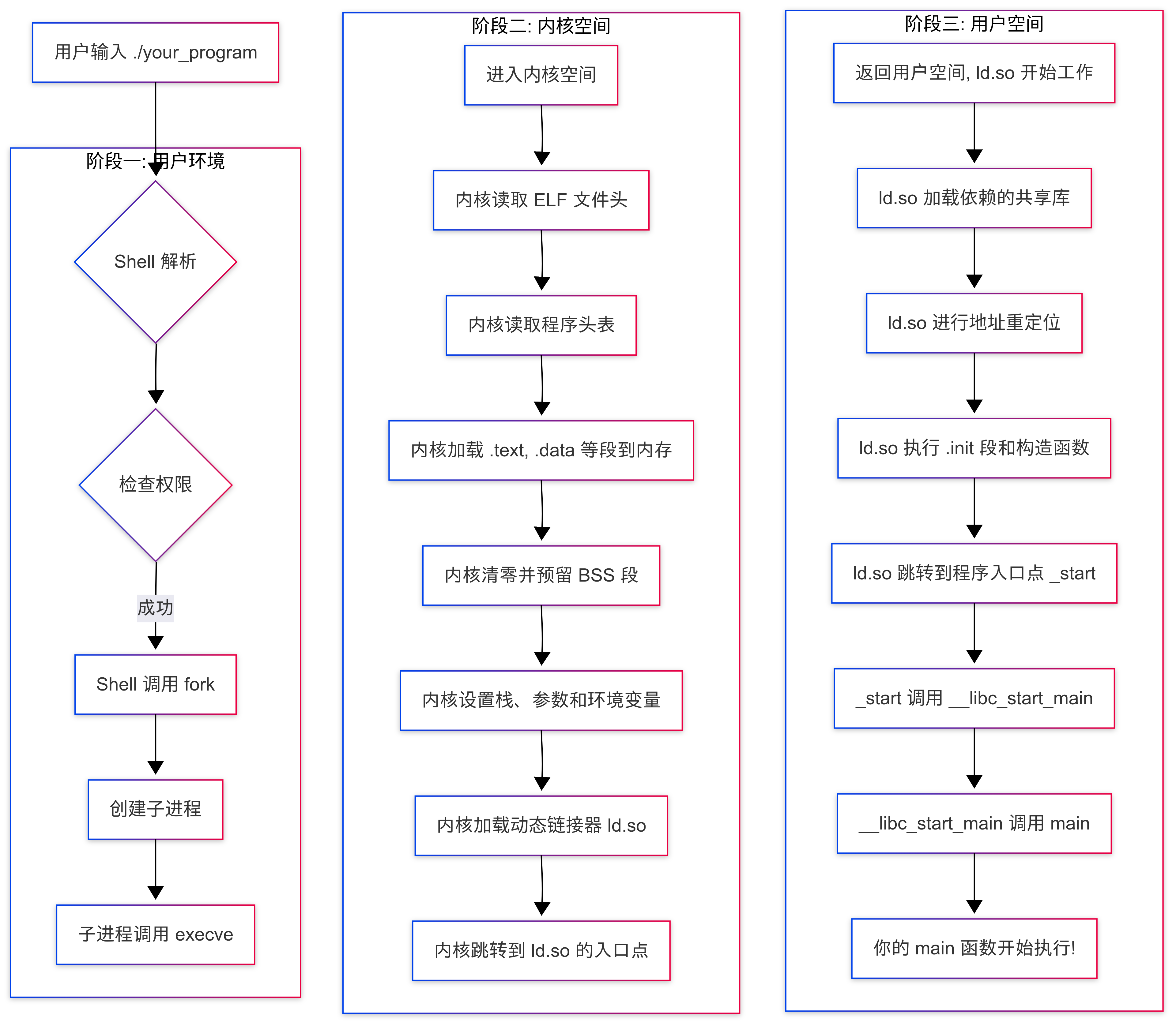 PT_LOAD->p_vaddr和PT_LOAD->p_memsz决定。设置权限。 - 上面的步骤建立了进程的虚拟内存区域,现在需要完成虚拟内存区域到物理内存的映射。需要注意的是这个映射并不是把磁盘的所有内容都直接复制到内存里面,而是在 MMU 触发缺页中断的时候才从磁盘中把需要的数据放入内存。