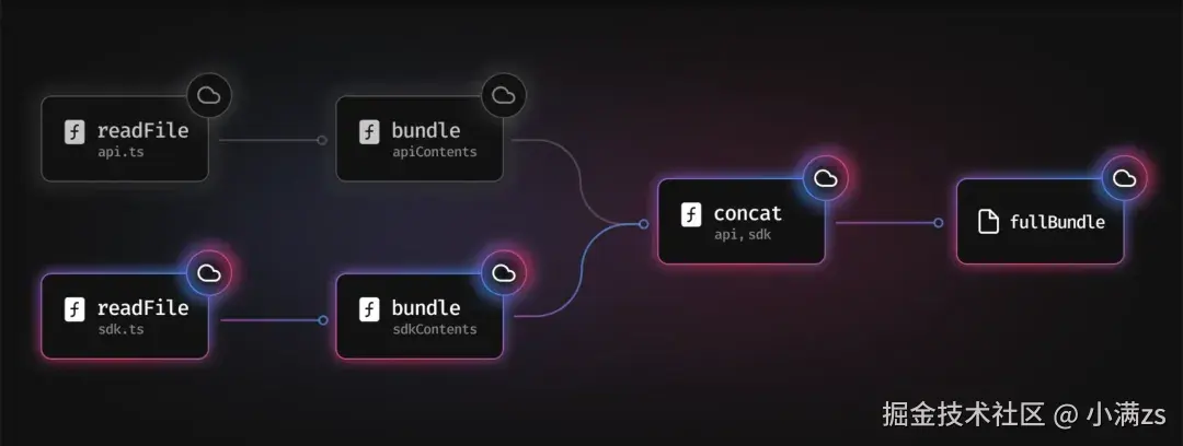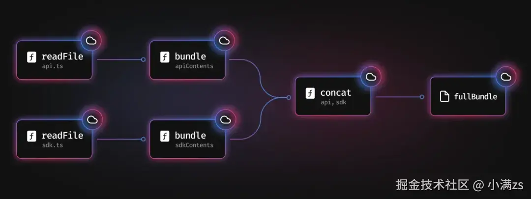 首先我们看到有两个文件api.ts/ sdk.ts 都调用了readFile函数,然后把这两个文件打包成bundle,然后拼接起来,最后打成一个fullBundle