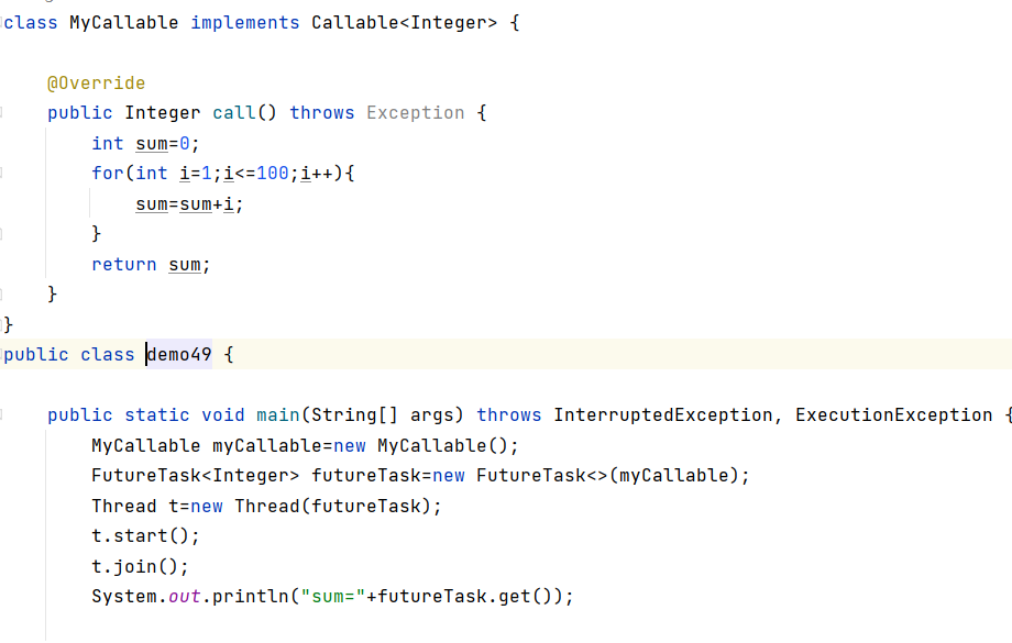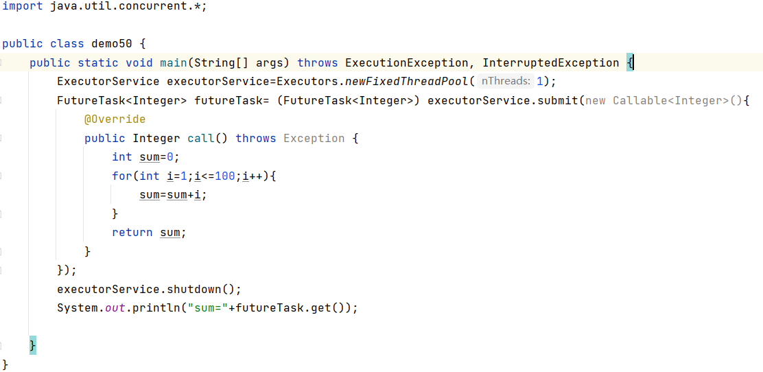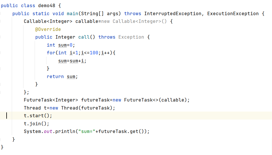 - 匿名内部类实现Callable接口/实现Callable接口结合FutureTask,适用于执行有返回值的任务