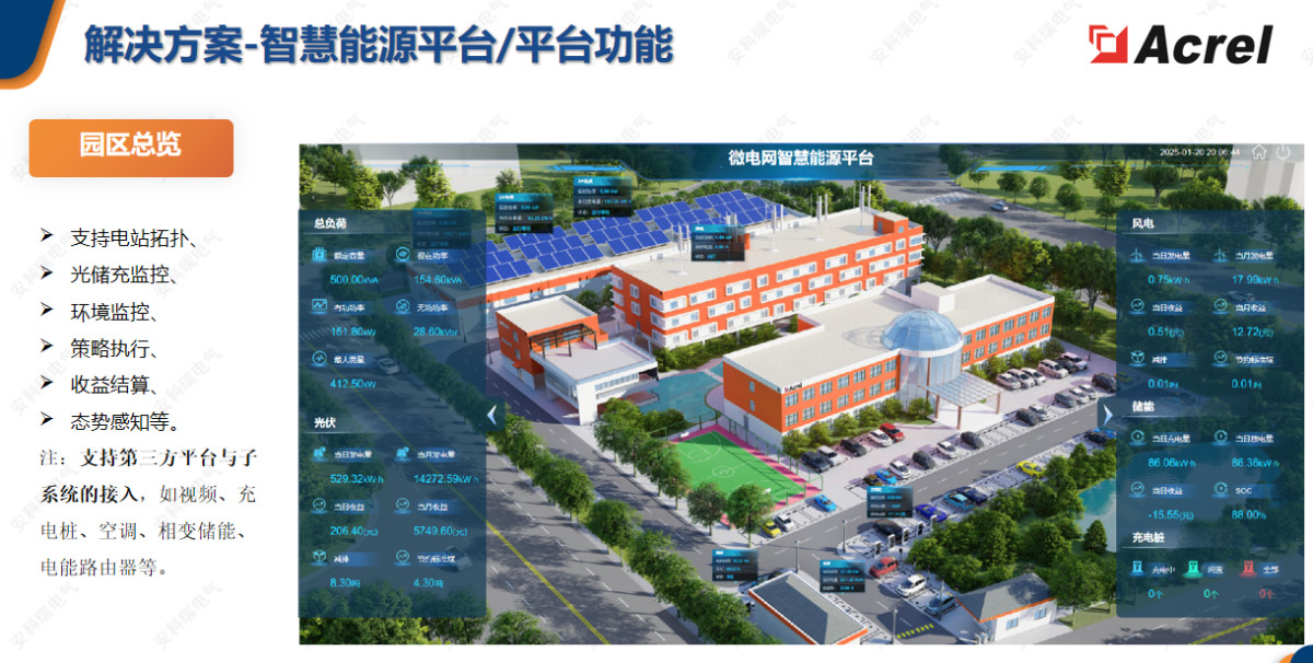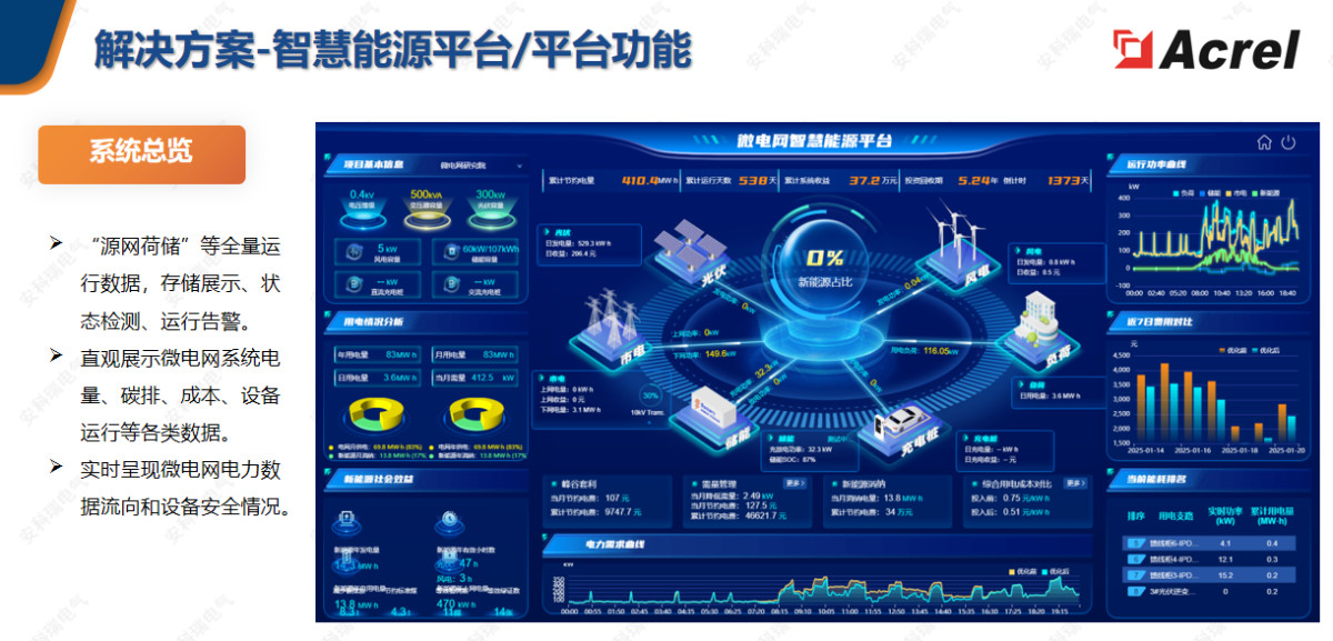 智慧能源管理平台是一种集成了现代信息技术(如物联网IoT、大数据、云计算和人工智能AI)的系统,用于监测、控制和优化能源使用,以提高效率并减少浪费。以电力系统监控数据为基础,可分系统、多维度展示微网运行状态,优化能源消纳效率,提高微电网系统经济、安全能源管理与智慧运维水平。